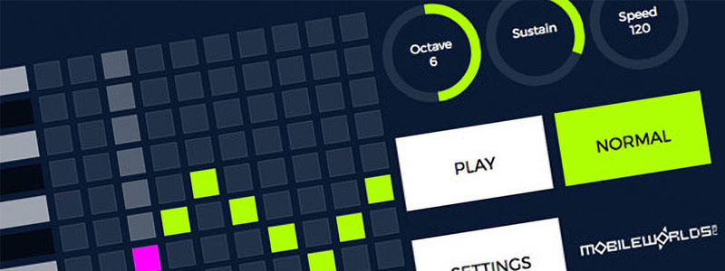 Die App spielt die eingeben Noten in einem Raster entweder von links nach rechts ab oder chaotisch. Man kann die Oktaven verändern, die Geschwindigkeit und Sustain – also die Dauer eines Tons. Über den Midi Button werden Informationen über die verbundene Hardware aufgerufen.
